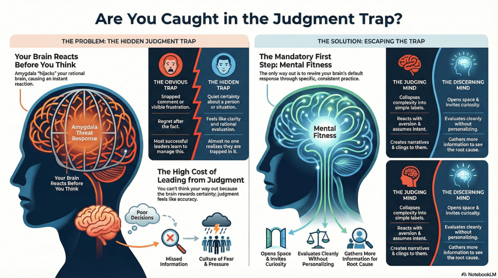 Here’s the thing: there are two types of judgment that derail leaders. The first is dramatic, the snapped comment, the visible frustration, the reaction you regret before the meeting even ends. Most successful executives have learned to manage this one. It’s the price of admission to the C-suite.